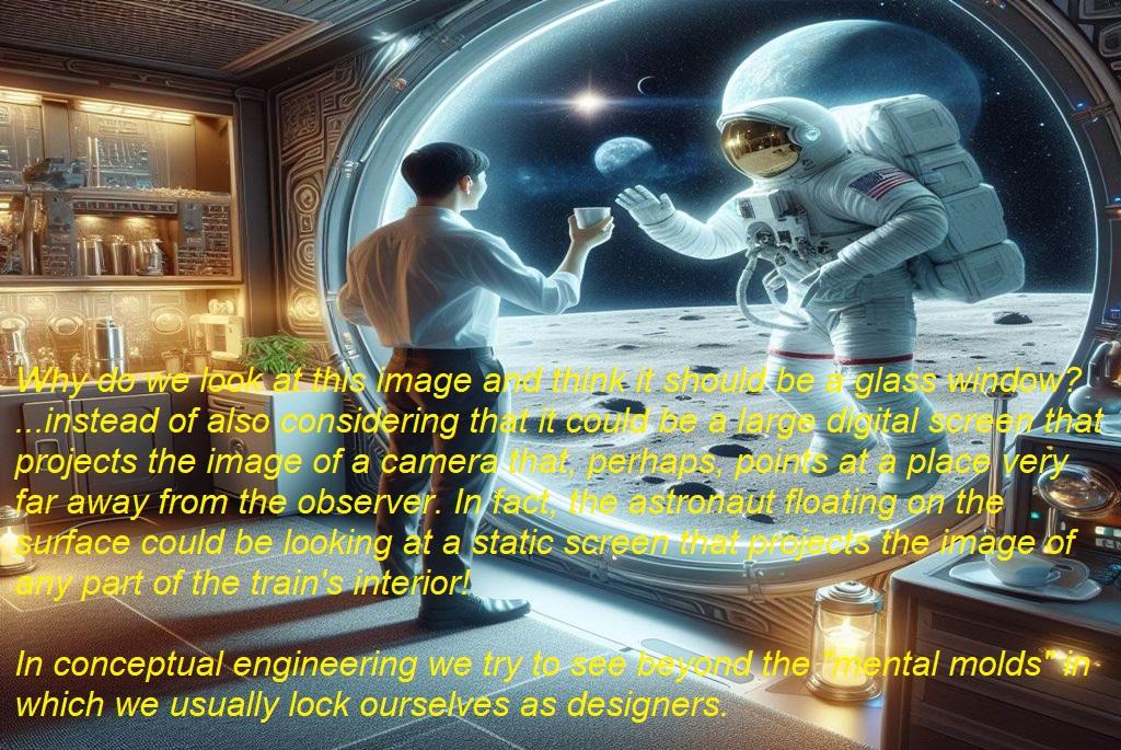 3.2) Who said that habitats have to have windows and that from inside we will observe through glass???? For structural reasons of the tank with which the habitats are built, it is most likely that they try to minimize "openings" (whether windows or hatches). This leads me to think about "using digital screens" as a replacement for real windows. These digital screens would "project the images taken by cameras" that can maintain (if desired) an almost fixed point of view, even on the lunar surface, moving synchronously with the progress of the train!!!