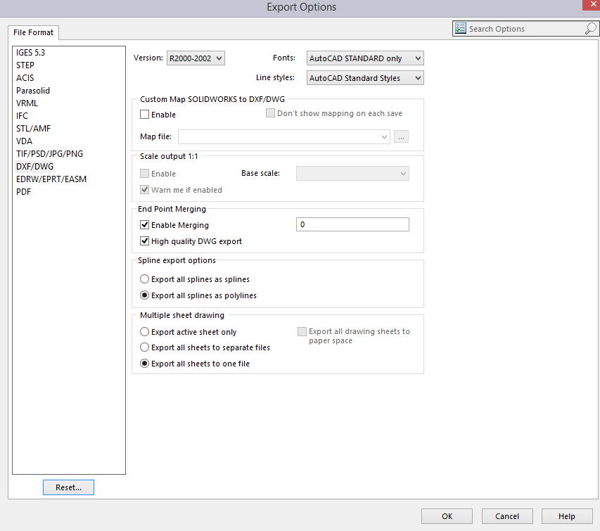 Oops, I just realized this string was referring to SolidWorks exporting - my bad. Just so you know, we have several guys in our department who work primarily in SolidWorks and will still use AutoCAD to go back and tweak their final laser or waterjet patterns for this specific issue to do with spline conversion.