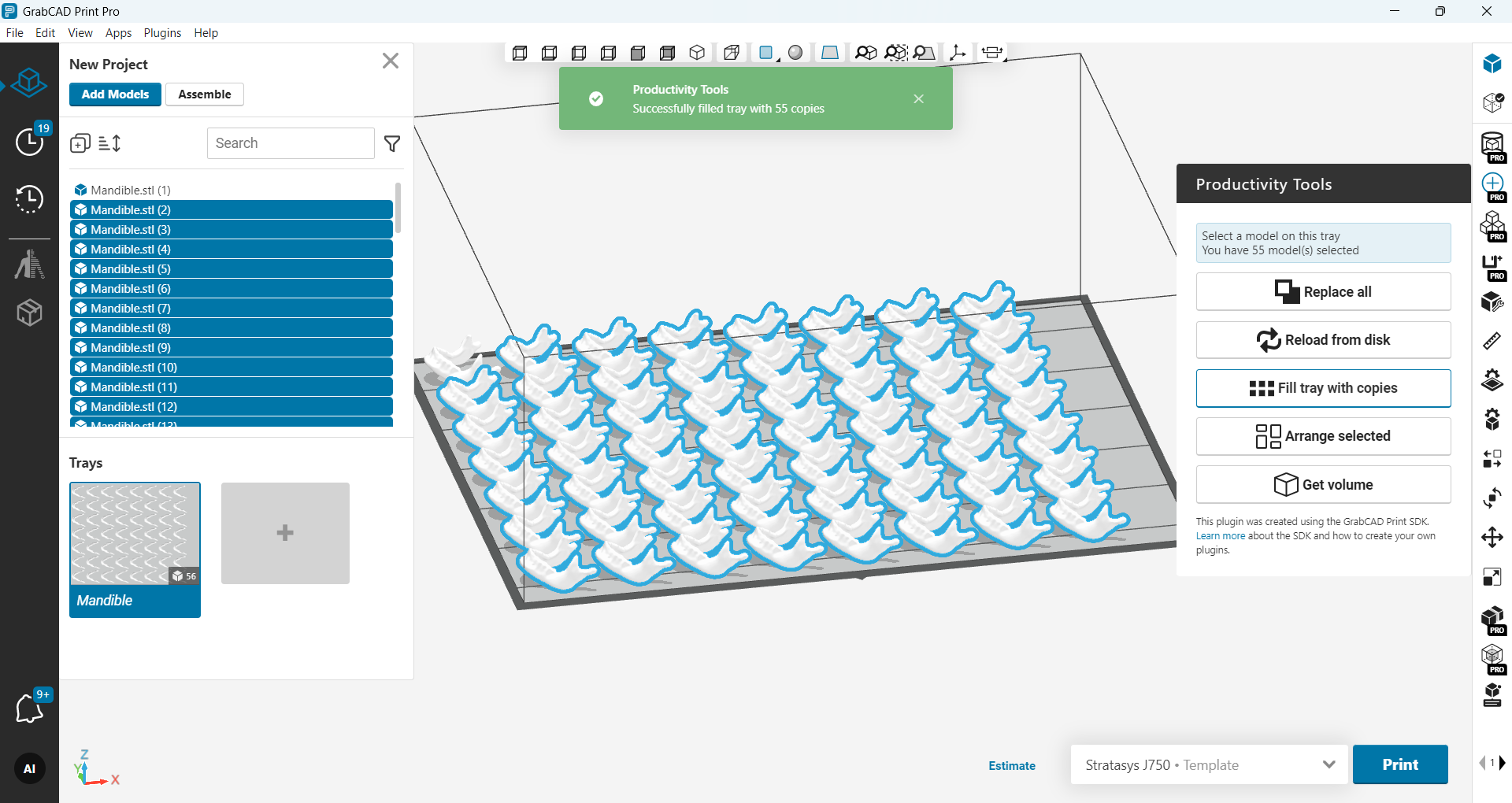 Fill entire tray with single click: insert model > hit Fill Tray with Copies > hit Print. Easy peasy lemon squeezy đđ