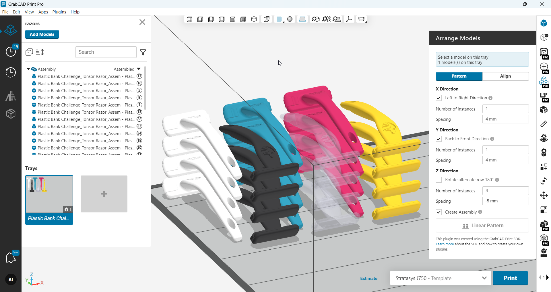 Flexible row/column patterns: you can choose to donât create the assembly yet - tweak positions or orientations as needed. When finished, select all instances and make the assembly, then print. Available for all printer technologies.