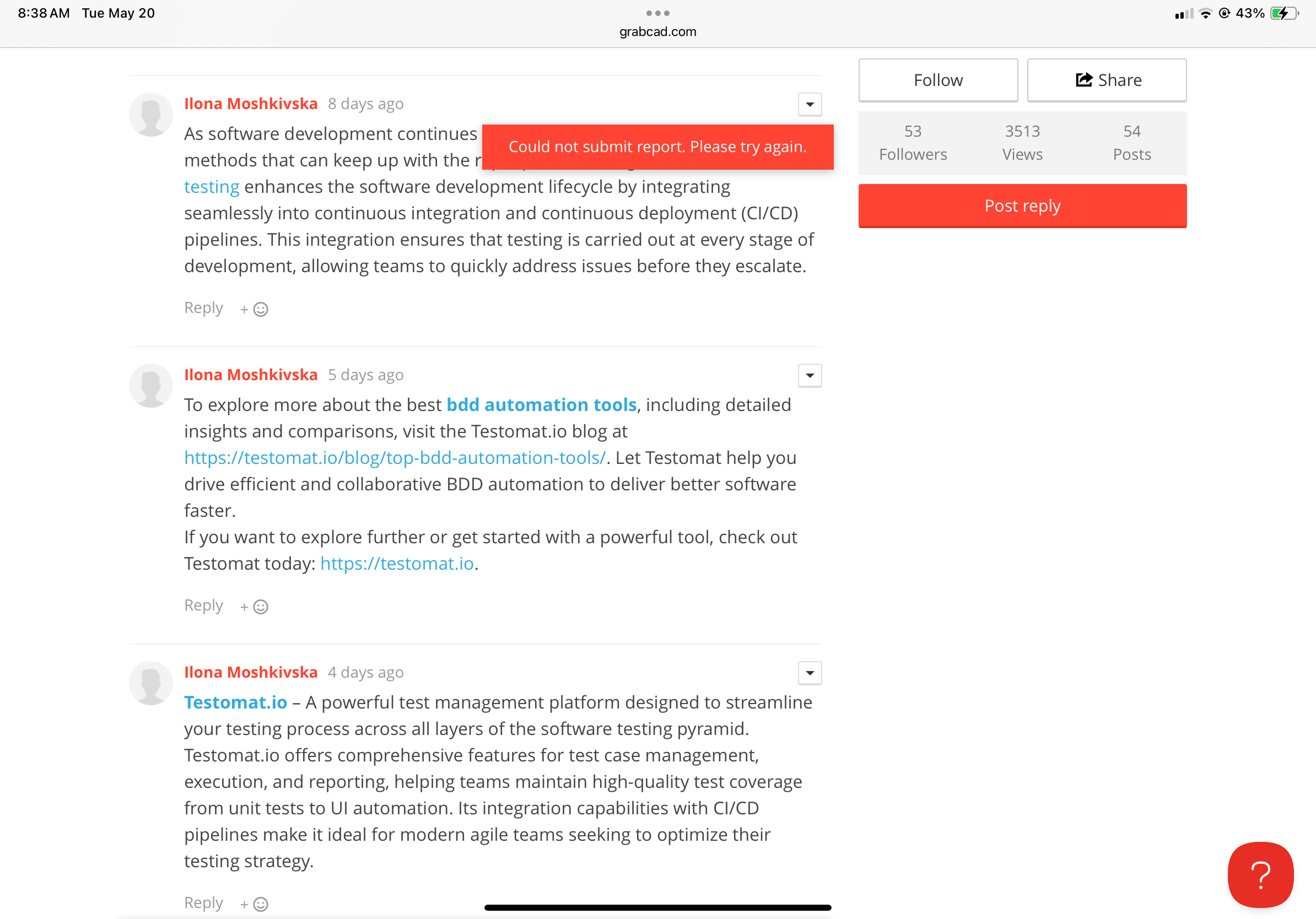 Cannot submit reports on spam posts nor on spamming users. Just get a pop up that says “Could not submit report. please try again.”