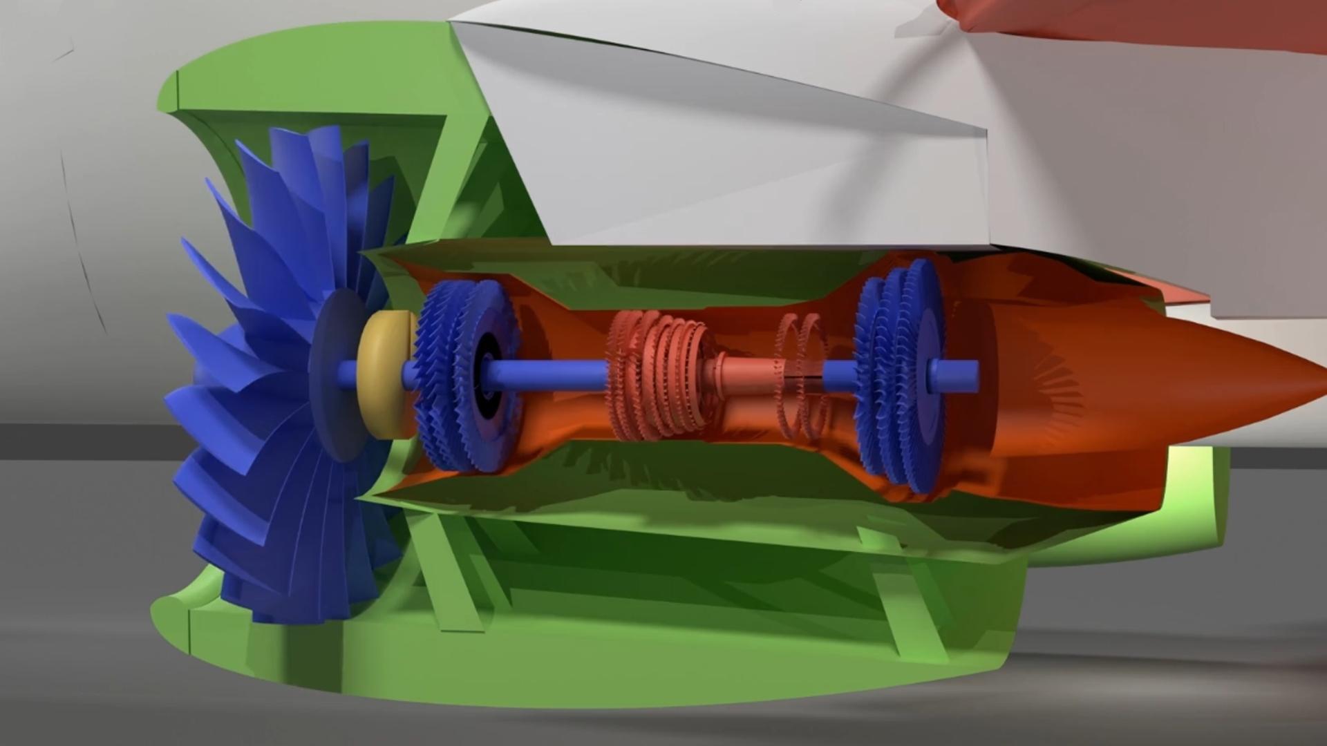 The aircraft has a twin-shaft, dual-circuit turbofan engine with a geared fan drive. Engine thrust is 110 kN (this is approximately 11 tons of thrust). Engine length is 3.5 m. Dry engine weight is 2800 kg. The low-pressure rotor has a 2-meter diameter fan consisting of 20 wide carbon fiber blades with titanium fairings. The fan generates 80% of the engine's total thrust. The engine's bypass ratio is 12:1. This means that only one-twelfth of the air from the fan enters the inner circuit. First, the air flow in the internal circuit enters the 3-stage low-pressure compressor located on the low-pressure shaft. One stage of the compressor consists of two parts. Rotor blades, movable - are fixed on the shaft, rotate with it. Stator blades, fixed - are fixed on the engine body, stand still. Passing through the stationary stator guide blades located on the engine body, they correct the angle of attack of the flow. Then the flow enters the rotor blades, which accelerate it. After leaving the rotor, the stator blades of the next stage go again, and so on. The function of the stator blades is to convert the air velocity into pressure. They straighten the flow so that it enters the following rotor blades correctly. In this way, they increase the efficiency of the engine by reducing turbulence. Rotor blades accelerate the air flow, giving it speed. When the rotor blades spin the air, the flow accelerates and acquires high speed, but the pressure is not yet high. Stator blades slow down this accelerated flow and convert its kinetic energy into increased pressure. If you let the air flow further without the stator blades, the next rotor will not work efficiently. After the low-pressure compressor, the air enters the 8-stage high-pressure compressor located on the high-pressure shaft. The high-pressure compressor compresses the air 50 times, heating it up to 300 °C, and the air enters the annular combustion chamber through small injector channels. The mixture of air and fuel ignites uniformly in the combustion chamber. It is because of the pressure that the fuel burns well in the combustion chamber. The combustion chamber maintains the correct direction and combustion. The combustion chamber uses ring-type injectors that spray fuel. The injectors are two-phase air-jet. The injector has channels for supplying fuel and air. The injector mixes the fuel with air, creating a finely dispersed fuel-air cloud for stable and complete combustion. Due to the air, the fuel is broken up into small droplets. The injectors operate at high temperatures and pressures. High spray uniformity prevents local overheating of the chamber walls. The smaller the droplets, the faster and more completely the fuel burns. Good atomization prevents the formation of soot, minimizing carbon monoxide and nitrogen emissions. The injectors operate in a wide range of modes from starting to cruising flight. The engine has 20 injectors, evenly distributed along the combustion chamber ring. They are resistant to surge and flame attenuation. Ignition is performed by electric spark plugs. There are two of them in the chamber, in case one fails. Electric spark plugs in the engine serve for the initial ignition of the fuel-air mixture in the combustion chamber, when starting the engine or during repeated ignition in flight. Electric spark plugs receive a high-voltage electrical impulse from the engine ignition system. This impulse causes a spark between the electrodes of the spark plug. The spark ignites the fuel-air mixture, which then maintains combustion due to the constant combustion process in the chamber. After the combustion chamber, the gas flow passes a high-pressure turbine made of a nickel-based heat-resistant alloy located on the high-pressure shaft, which drives the high-pressure compressor. After the high-pressure turbine, the gas enters the low-pressure turbine located on the low-pressure shaft and driving the low-pressure compressor and fan through a planetary gearbox. The engine's gearbox optimizes fan and turbine operation. The gearbox optimizes fan and turbine performance. The turbine is highly efficient at high speeds. The fan operates more efficiently at low speeds. The gearbox has a 3:1 gear ratio. The fan speed is 3,000 rpm, and the turbine speed is 9,000 rpm. The gearbox is designed for high torque with minimal energy loss. It allows for a fan diameter of up to 2 meters while maintaining the engine's compact size. The fan blades rotate at approximately Mach 1. The large, slow-speed fan reduces noise levels by almost 75%, as perceived by humans. Fan noise levels are 50% lower than those of gearless engines. The larger fan draws more air through the outer contour, reducing specific fuel consumption and increasing thrust during takeoff. This optimization reduces fuel consumption by 20%. Fewer turbine stages are required because the turbine spins faster and transfers energy more efficiently. At the end of the inner circuit, the hot gas exits through the gas generator nozzle. At the end of the outer circuit, cold air exits through the fan nozzle. The entire engine is housed in a carbon fiber casing. The engine uses fuel obtained from recycled waste, including plastic bags, paper packaging, and plant residues. The waste is processed and separated by density, then liquid hydrocarbons are synthesized from the resulting mass using pyrolysis, which heats the waste in the absence of oxygen. Pyrolysis converts plastic and organic matter into liquid hydrocarbons. The processes at a waste processing plant are similar to those performed with crude oil in an oil refinery. The resulting engine fuel is similar to aviation kerosene.