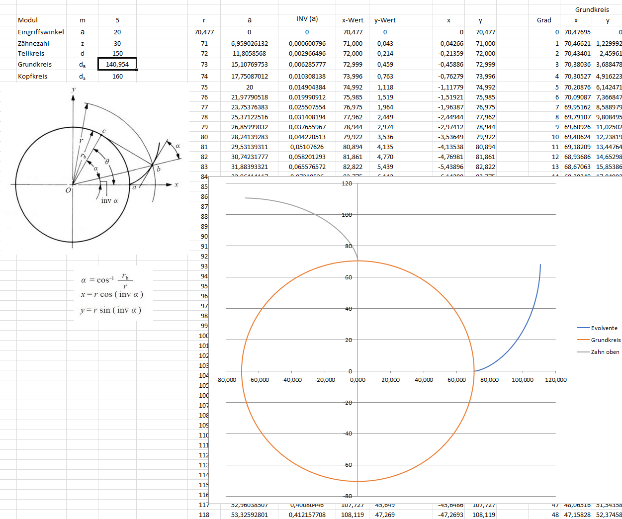 long time no post in the group. In my spare time I tried some "manual" design of involute spur gears. Therefore all starts with the excel calculation of an involute which can be imported into the CAD system.