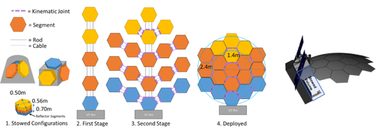 Our key example is an Earth observing antenna. The antenna's segments are stacked neatly on top of each other, taking up a compact space (1). After launch, the segments are released from their locked positions, and a set of high strain rods deploy the system into an initial configuration (2). Each element is aligned correctly by two high strain rods, so they can be pulled together. Once the antenna opens up, the cables start retracting, gradually pulling in each segment until they form the final deployed shape (3). The segments are precisely located relative to each other using special joints, with an accuracy of around 20 microns, and held in place by the tension in the cables. (4) Upon fully deploying, the latching mechanism from the “Positive Connections” challenge locks the segments together. The overall surface alignment has a root mean squared (RMS) error of approximately 60 microns. Check out the image below for a visual representation of how the antenna transforms from a packed state to a fully deployed state.