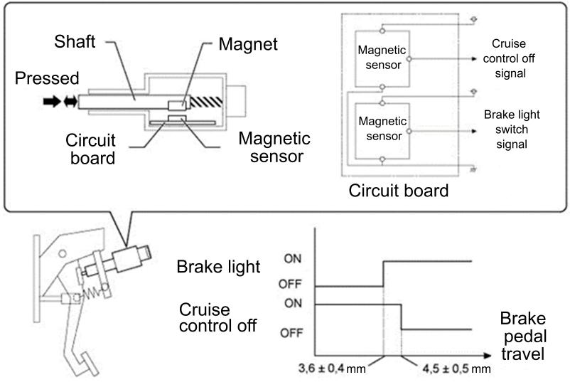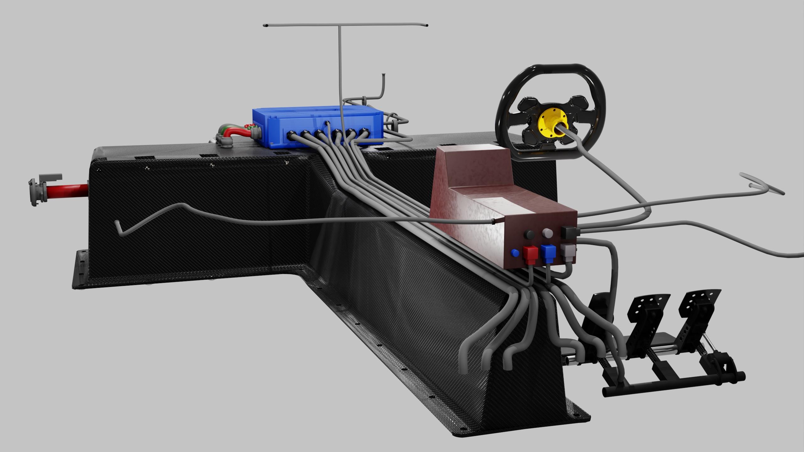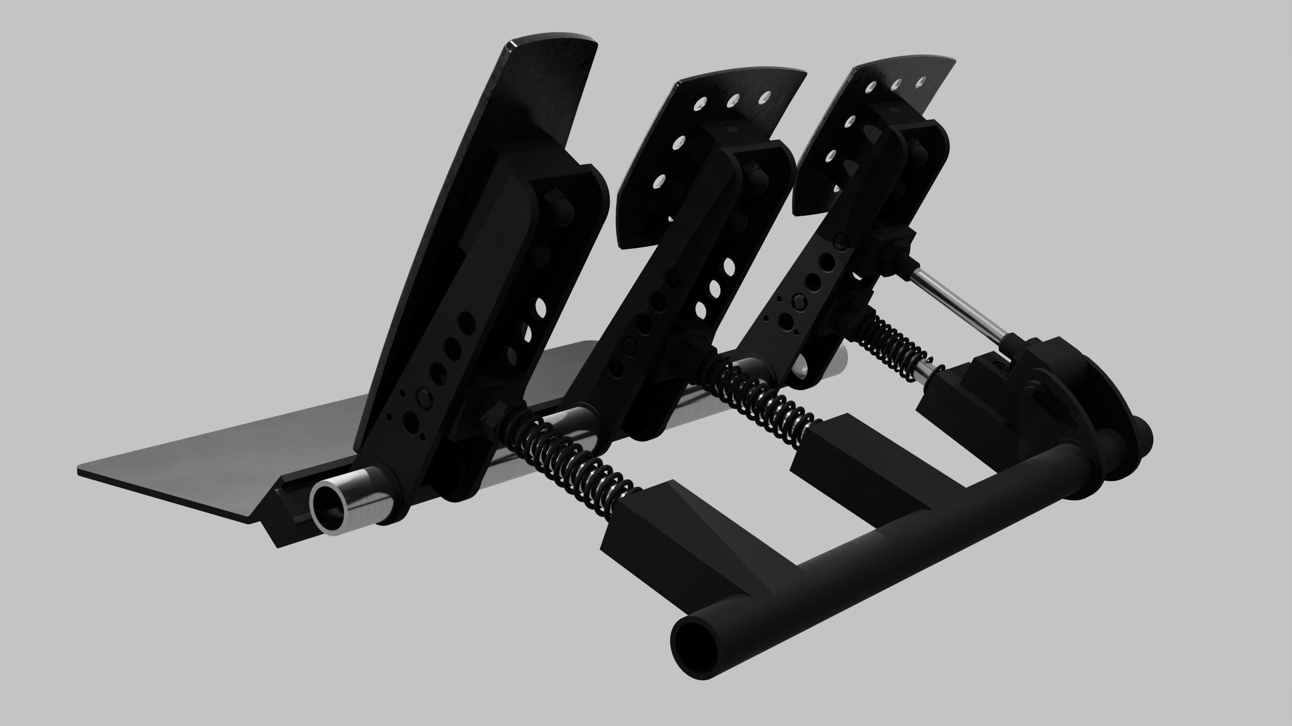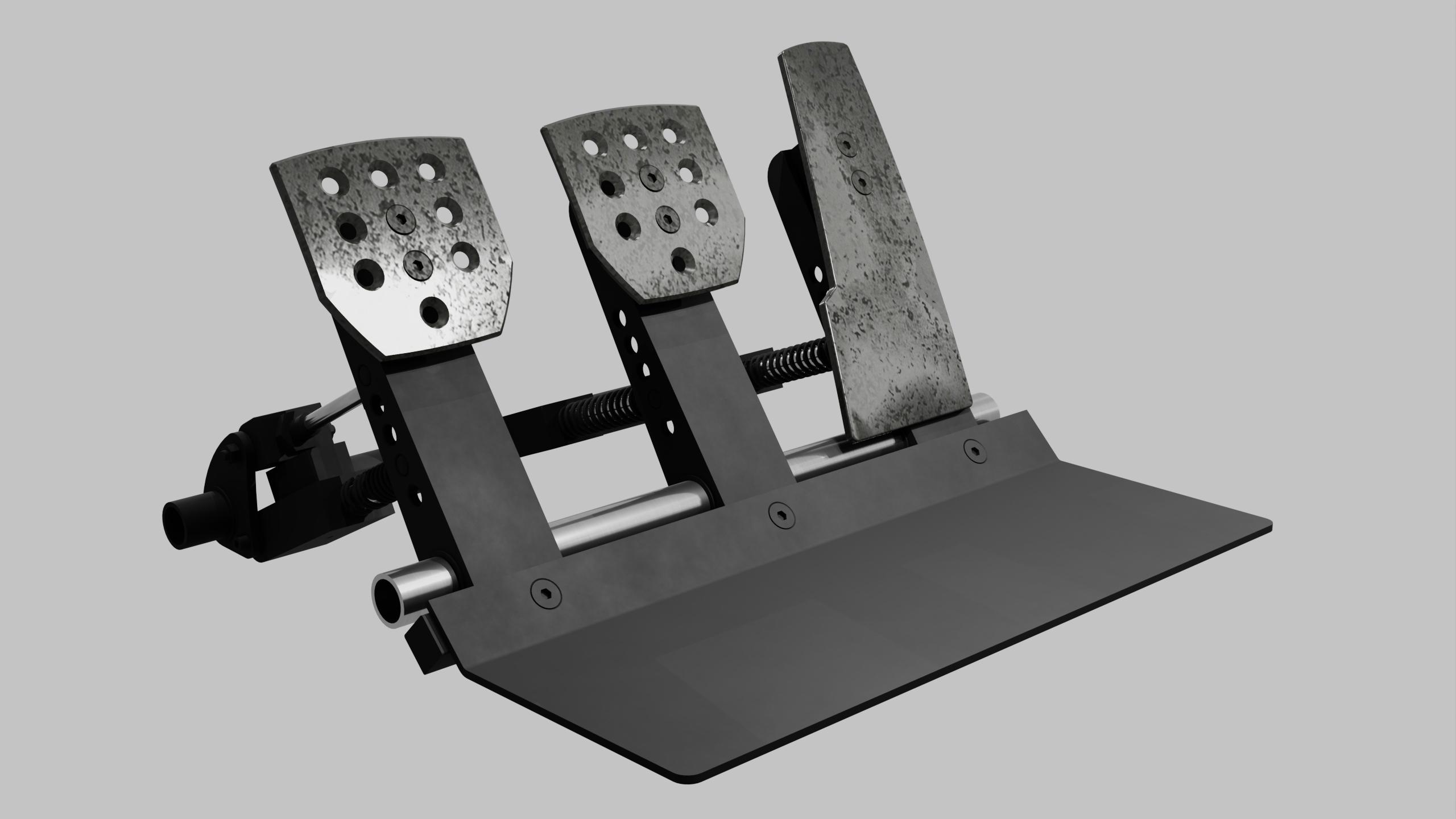 The pedal unit in the Dubina Evo car consists of three pedals. The left pedal is the parking brake, the center is the brake pedal, and the right is the current pedal. The pedals are made of aluminum structural alloy. The pedals adjust the position of the pedal plates, the angle of inclination, and the spring stiffness. The current and brake pedals are electronic. They are controlled through a central microcontroller. When the brake pedal is pressed, the shaft and magnet move simultaneously. Magnetic sensors on the printed circuit board detect the length of the magnet's movements and provide output signals to the microcontroller. The microcontroller processes the signals and controls the motors. Pedals with a magnetic sensor are highly accurate and reliable because they do not have rubbing parts that are subject to wear. The parking brake is mechanical. When you press the parking brake pedal, the steel cable pulls out the stopper, which falls into the gear groove installed on the drive shaft and stops it. The pedals are installed on the cockpit floor for ease of use. The size of the pedal block is 43x43x28 cm.
