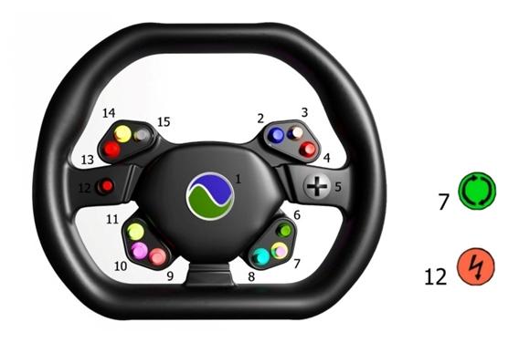 1 β Horn; 2 β Windscreen Washer; 3 β Windscreen Wipers; 4 β Right Turn Signal; 5 β Menu Pad; 6 β Reverse; 7 β Axis Drive; 8 β Voice Assistant; 9 β Hazard Warning Lights; 10 β Speed ββLimiter; 11 β Driving Mode; 12 β Hyper Speed; 13 β Left Turn Signal; 14 β Low Beam, High Beam; 15 β Windscreen Defogger.