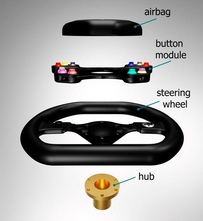 The steering wheel of the Dubina Evo car is designed for sporty driving. It is specially designed to control many parameters of the car while driving. The diameter of the steering wheel is 310 mm. The small diameter of the steering wheel increases the speed of turning. This allows the driver to effectively control the car at high speeds. The steering wheel is made of carbon. Carbon has high strength, low weight and low thermal conductivity. The steering wheel consists of four parts: airbag, module with buttons, steering wheel, steering wheel hub.