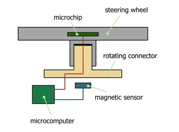 The peculiarity of the steering control is that it uses a magnetic sensor to determine the angle of rotation. With the help of this sensor, a signal is sent to the microcomputer to control the rotation frequency of the electric motors depending on the angle of rotation. The magnetic sensor, installed in the fixed part of the instrument panel body, determines the position of the steering wheel with an accuracy of 0.06 degrees. The advantage of using a magnetic sensor is its small size, contactless operation, high accuracy, and long service life.