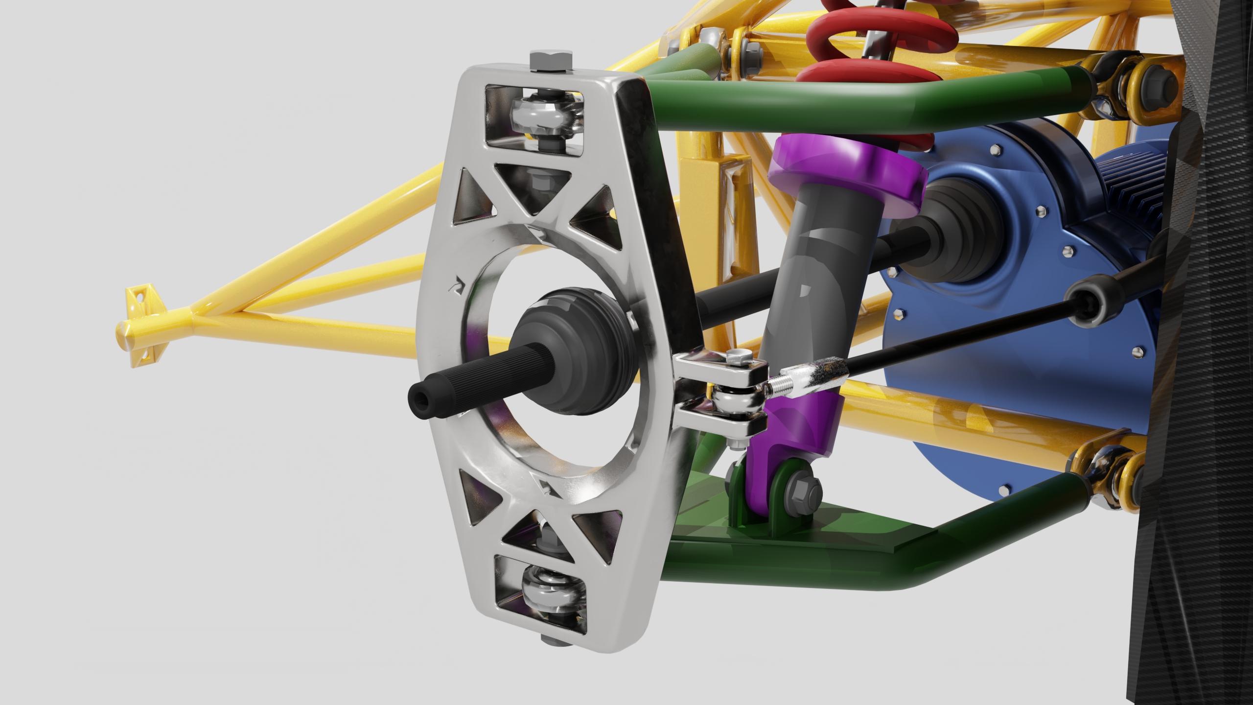 The steering knuckle in a double wishbone independent suspension is a suspension element that connects the upper and lower suspension arms and allows the front wheel to rotate during turns. This element is also known as a pendulum knuckle or pendulum bushing. It provides stability and maintains the wheel in a vertical plane. The design of the double wishbone suspension allows you to adjust the angle of the wheel to optimize handling and traction. The knuckle body has a groove with holes for installing the wheel hub. The knuckle in the rear double wishbone independent suspension is a suspension element that connects the upper and lower arms to the wheel hub, providing stability and maintaining the wheel in a vertical plane. There are four ears on the knuckle to attach the suspension arms. The car does not have mechanical brakes, the brake in the car is electronic, the car is braked by engines. Therefore, there are no mounts for the brake disc on the knuckles. The suspension knuckles are made of structural aluminum alloy.
